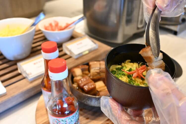 料理は、自分で麺を湯がいてラフテーや紅しょうがなどトッピングして楽しむ沖縄そばや、ミニサイズのサーターアンダギー、沖縄黒糖パン、ゴーヤ入りビーフカレーに、沖縄の炊き込みご飯ことジューシーと、沖縄色!