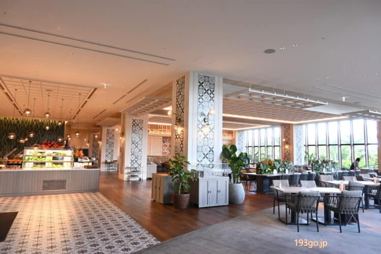 ホテルに入ると広々したロビー、奥に朝食や夕食ビュッフェの会場となるレストラン。