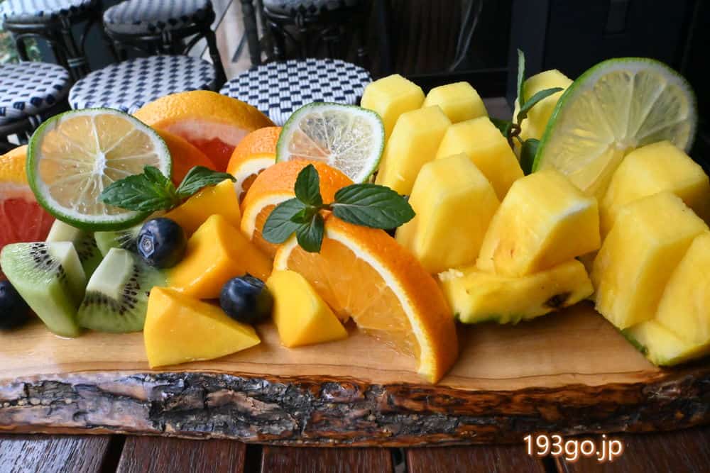 パイナップルやマンゴーなどの豪華フルーツの盛り合わせに、