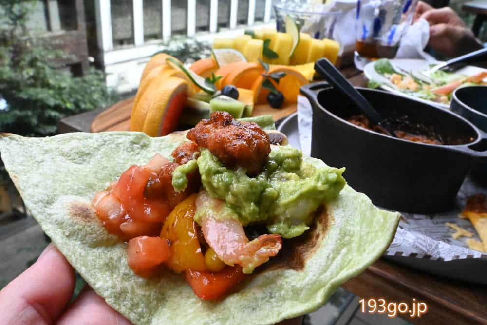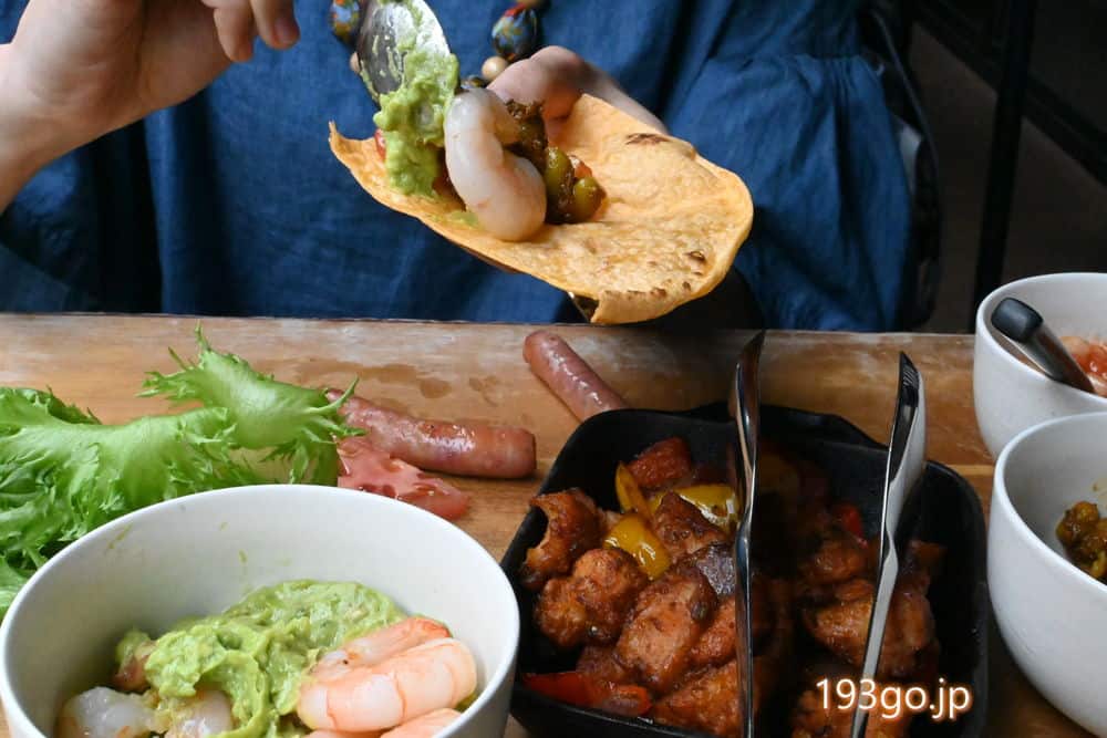 メキシコの主食のもちもちしたトルティーヤに、メキシカンチキンファヒータや海老、アボカドディップに、チリコンカンやサルサソースなど乗せて巻いてガブっ。