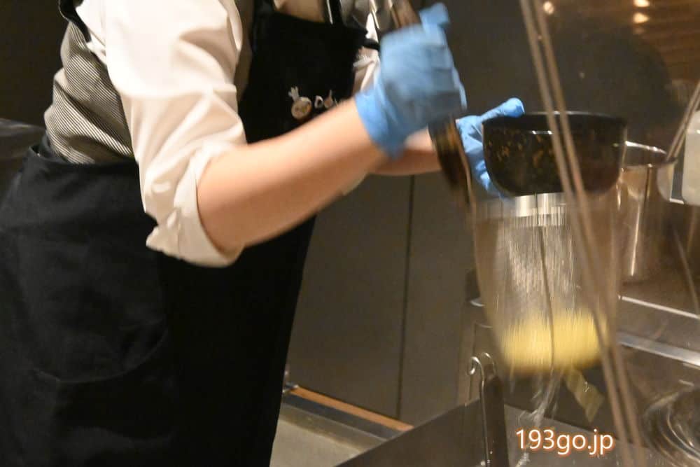 丼に、熱々の汁と湯切りした麺が入れられ、メンマとあおさ海苔と、葱がトッピングされる。