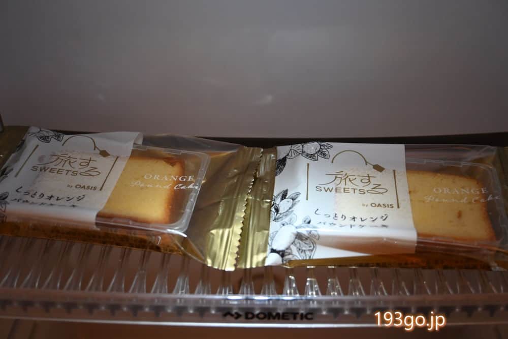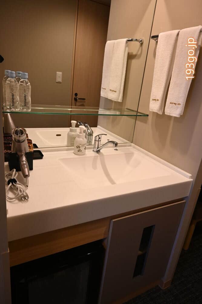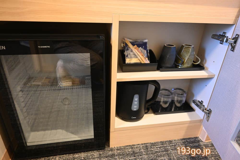 入口はいって廊下に洗面台。その下に電子ケトルやカップ、グラス、コーヒーセット。ミニ冷蔵庫にはウェルカムサービスのパウンドケーキも。冷えてて美味しい!オリジナルのペットボトル水。