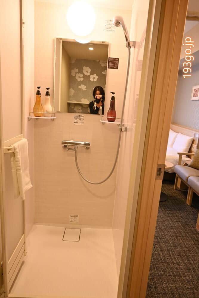 ハンガーや荷物を置けるスペースに、独立トイレとシャワーブース。