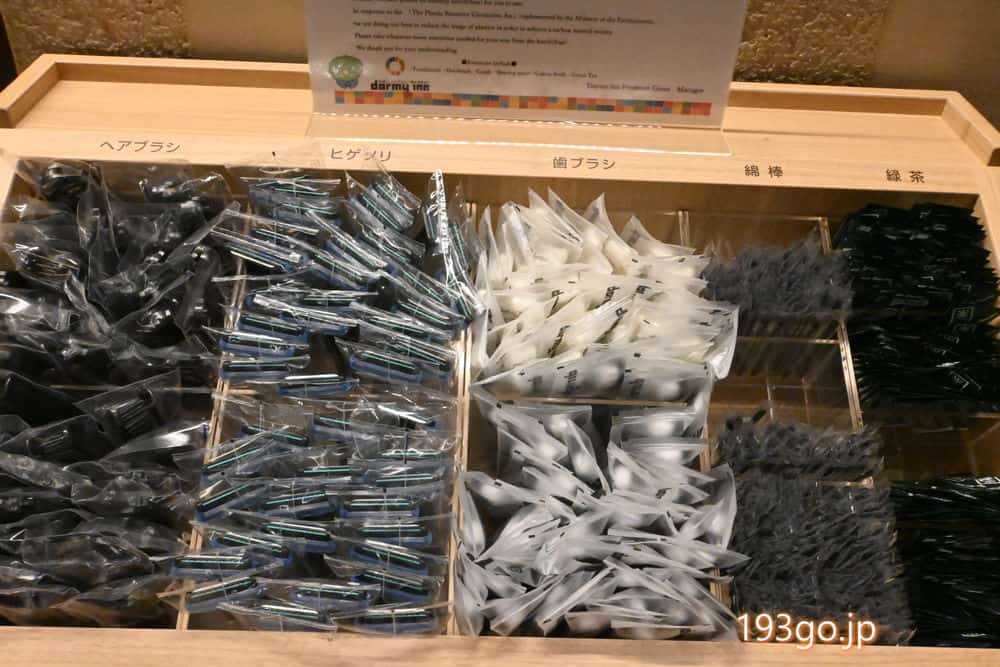 1階フロントでチェックインを済ませ、必要なアメニティをピックアップ。お茶や歯ブラシ、カミソリ、ヘハブラシなどが用意。
