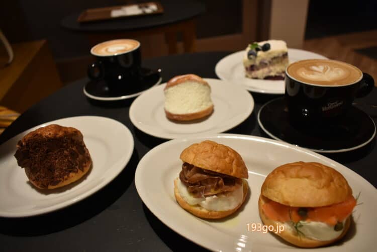 本格的なエスプレッソやカプチーノと共に銀座店限定のミニサイズのマリトッツォと、クリームでは無くチーズや生ハム、スモークサーモンなどをサンドしたセイボリーのマリトッツォもありユニーク。
