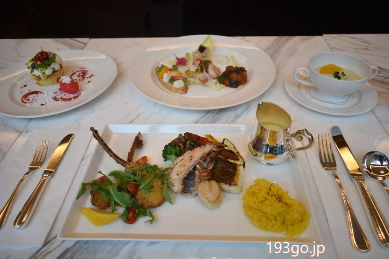 ミラノ風仔牛の骨付きカツレツ、ミラノ風サフランリゾット、オマール海老と白身魚のインパデッラ