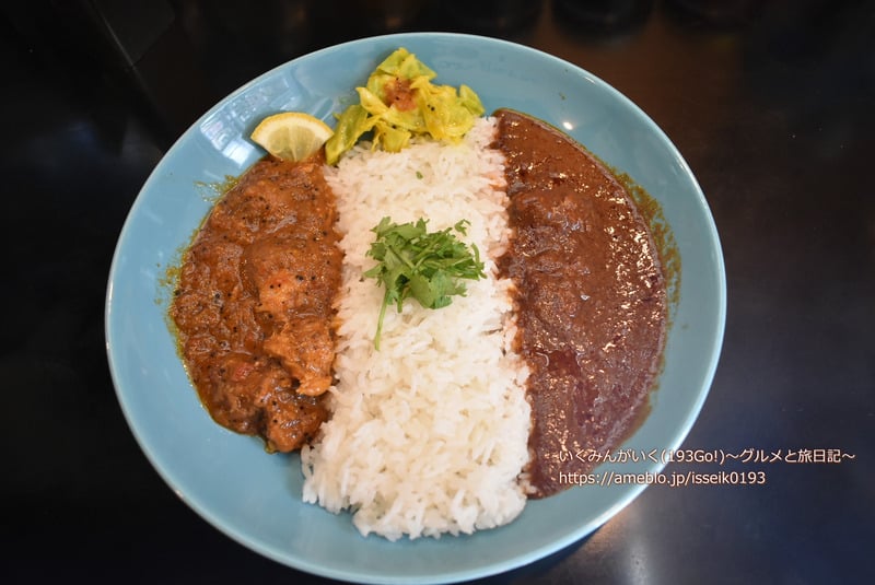 彩りが良いあいがけカレー!チキンペッパーフライとポークビンダルーの2種をチョイス