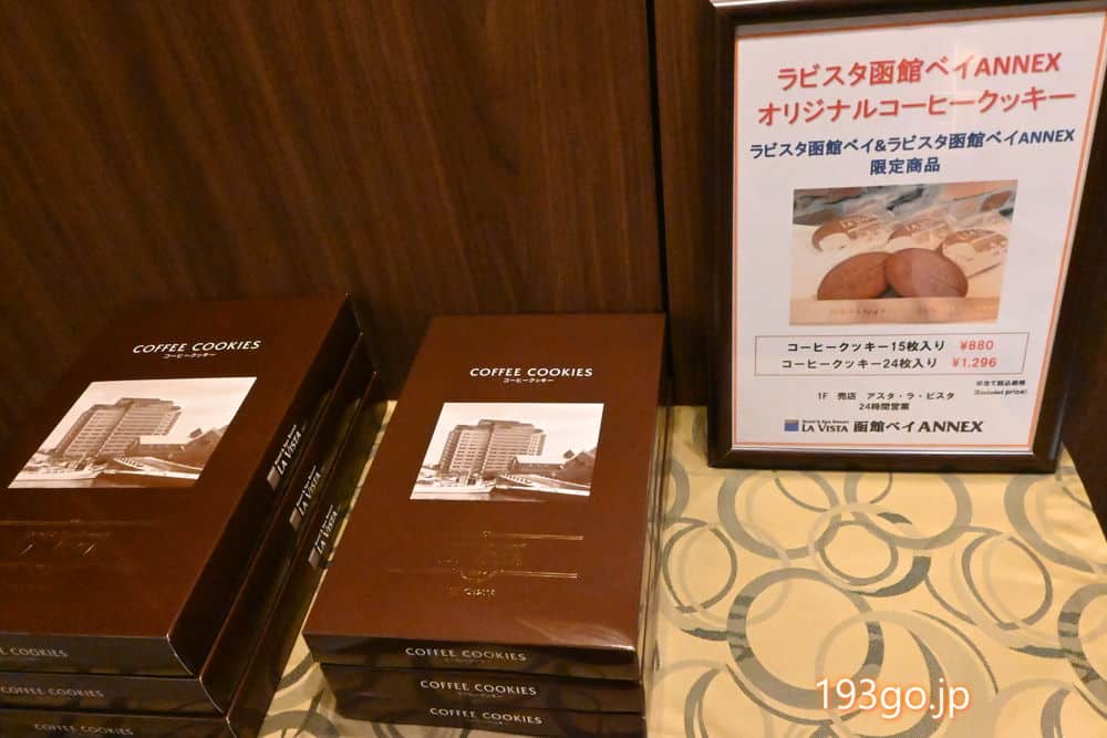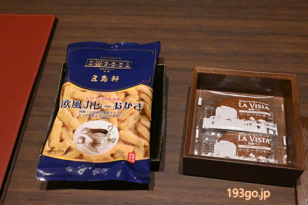 お茶菓子は、ラビスタ函館ベイ オリジナルのコーヒークッキーに、五島軒のおかき。