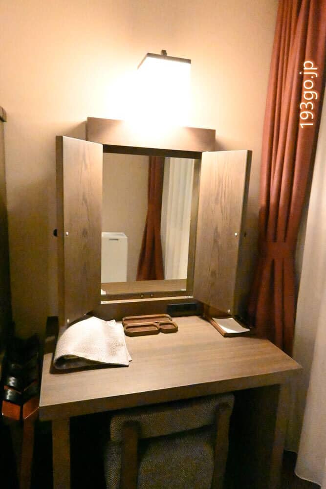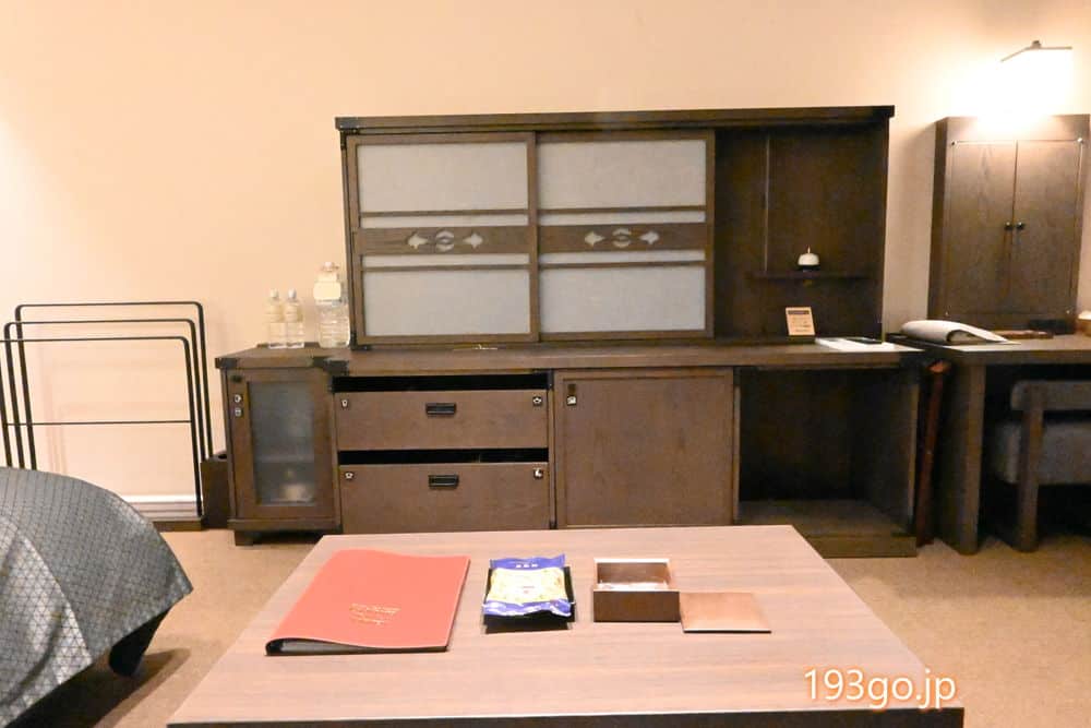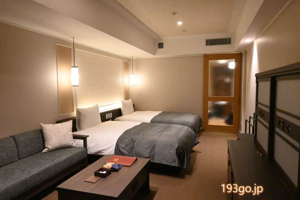ベッド2台と、ソファーとテーブルが置かれたリビングスペースには、鏡台や戸棚付きのテレビ台などレトロなインテリアがいいね。高級感ある。
