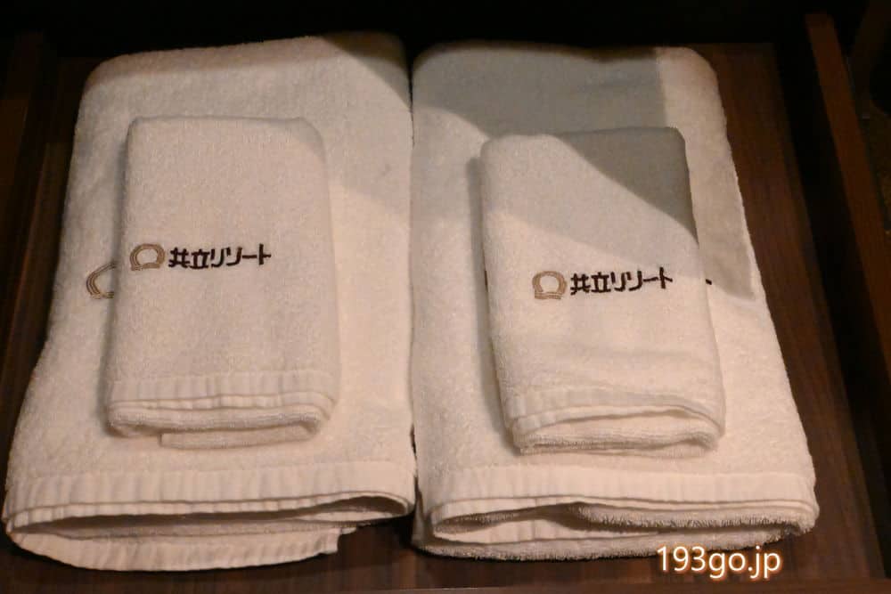 それぞれに脱衣場が備わり、タオルも積まれてる。中から鍵をかけるスタイル。