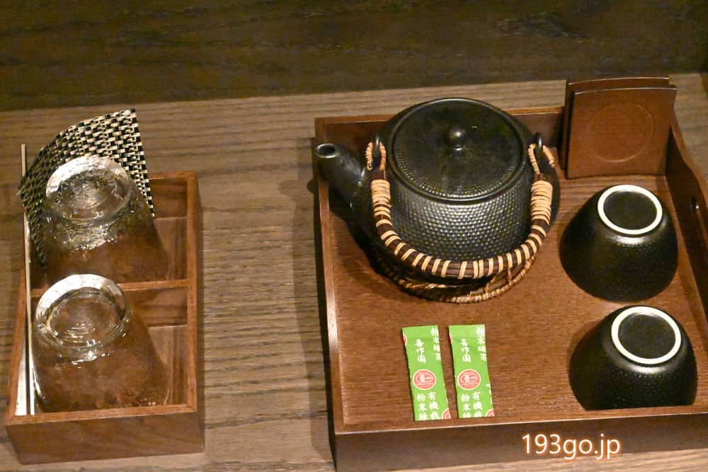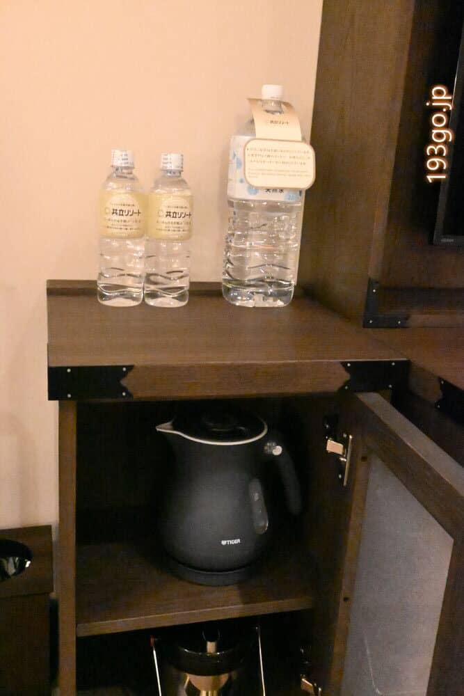 フリーウォーターのペットボトルは、350mlが2本と、1ℓも置いてあるので、お茶やコーヒーも十分楽しめる。