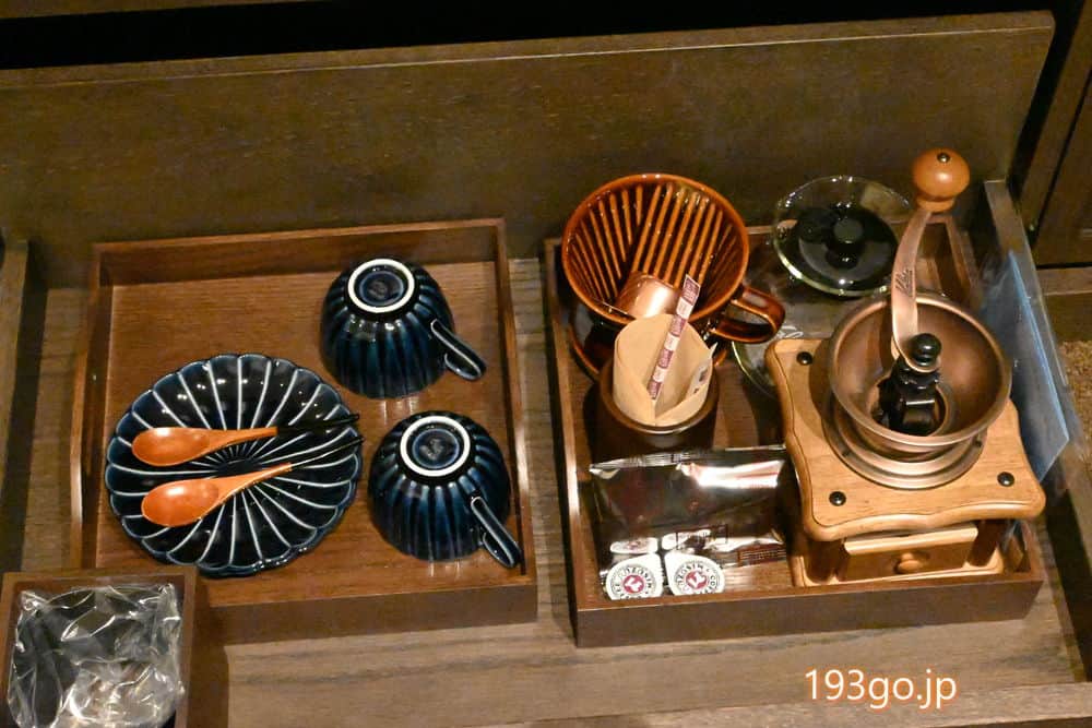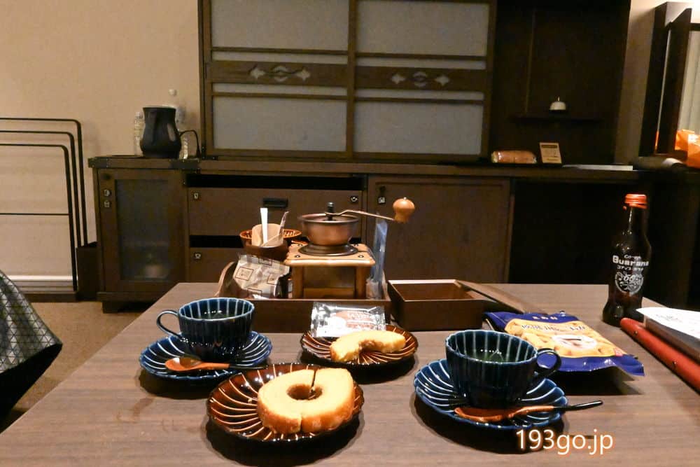 茶器の他、手動式のコーヒーミルも。これが置いてあるホテルは初めて。珈琲豆も用意されてるので、早速、挽きたてのコーヒーと、小樽土産のバウムクーヘンを。