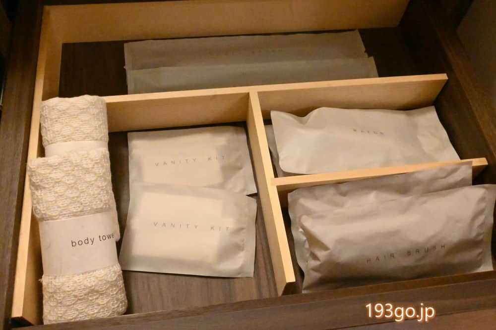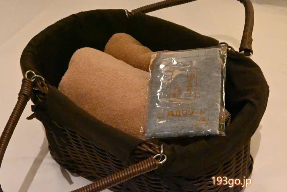 上下別の館内着、タオルセット、籠バッグなどのアイテムが揃う。