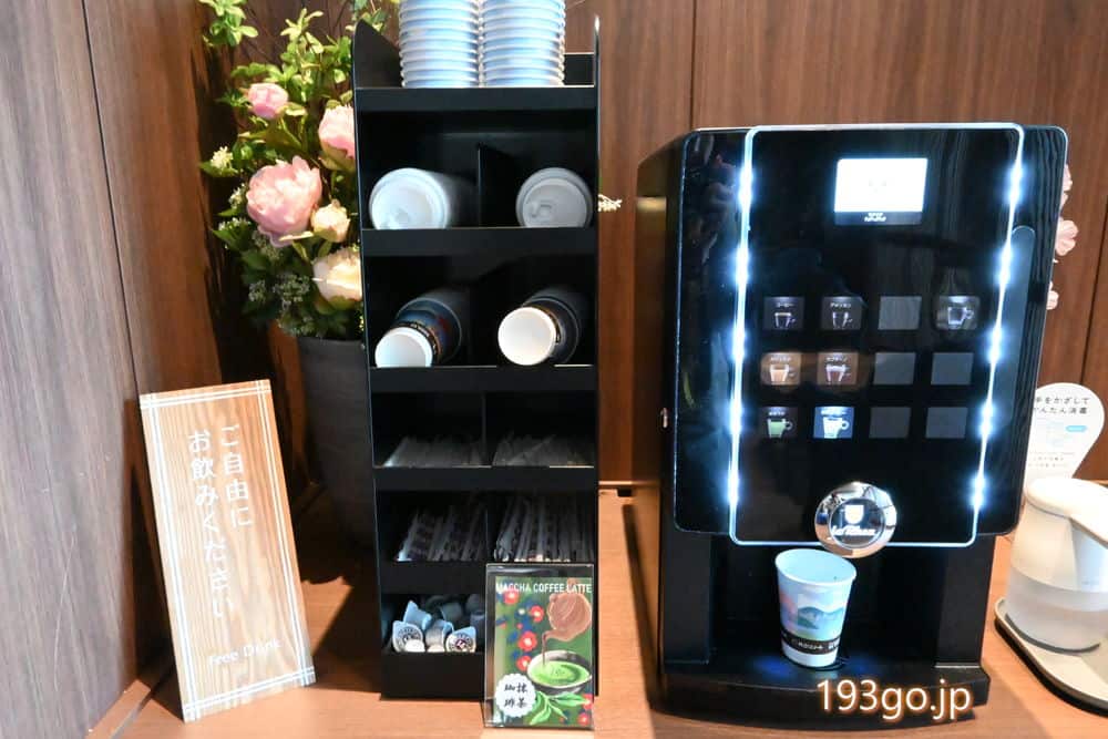 ゆったりしたソファーが置かれたラウンジスペースで、ウェルカムサービスのコーヒーを。(24時間セルフサービス)