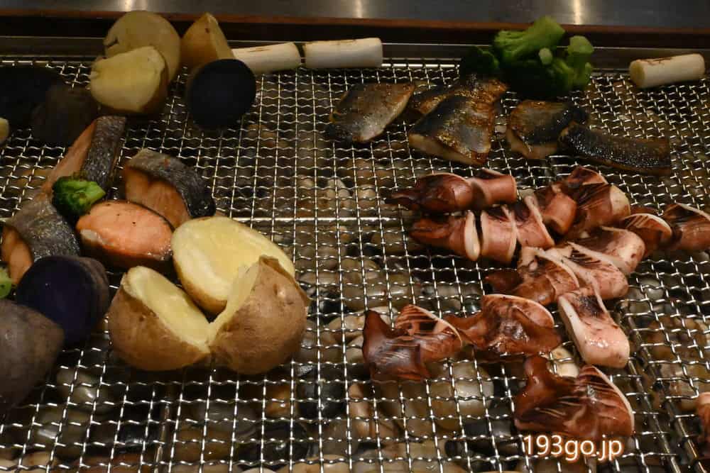 じゃがいもは数種類楽しめ、イカや鮭などのシーフードも網で焼いてもらえて嬉しい。