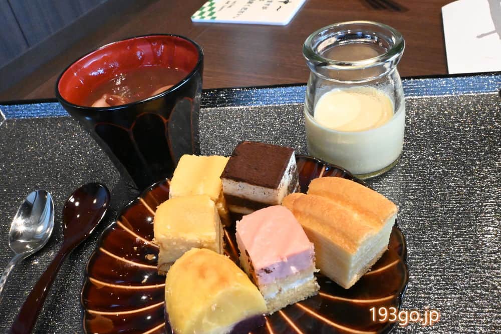 スイーツはバウムクーヘン、函館牛乳のプリン、お汁粉も