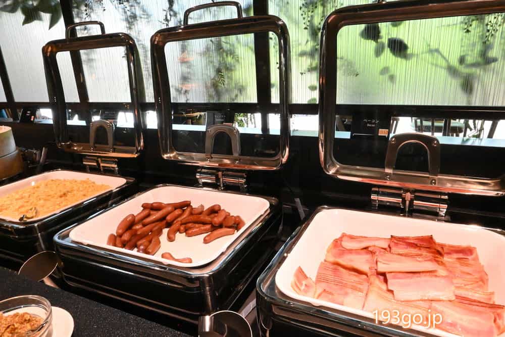 ベーコン、ソーセージ、卵料理、点心。
