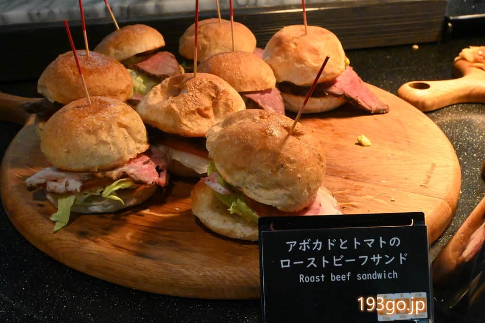 キッチン側にはミニバーガーや、パイ、キッシュ、フレンチトーストなどの作りたて料理が並ぶ。