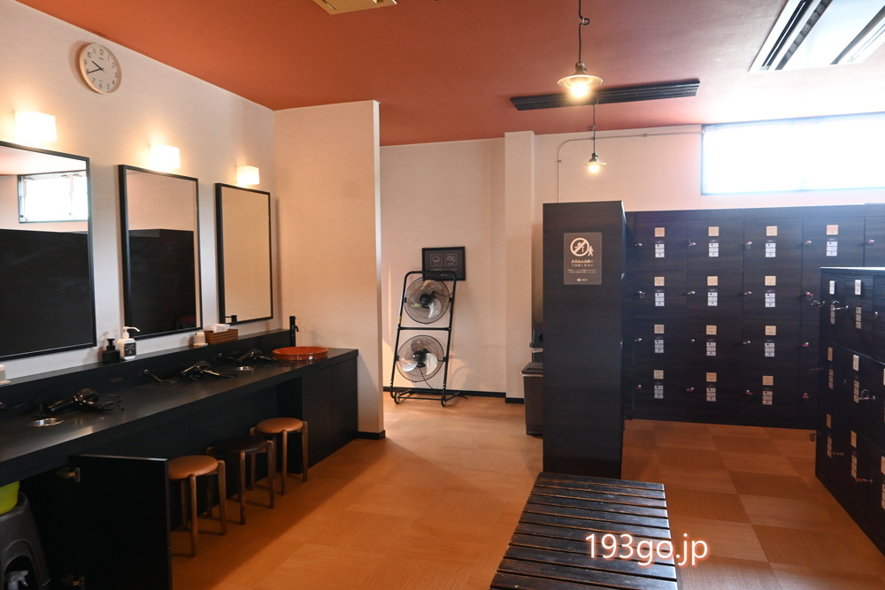 脱衣場には鍵付きロッカー、脱衣かご、洗面台にはドライヤーとハンドソープと綿棒など。