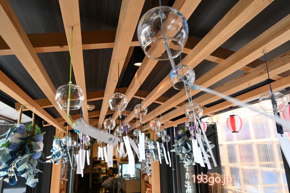 1階ロビーにフロント、売店があり、風鈴が飾られた渡り廊下を進むと、レストラン、そして広々した休憩スペース。