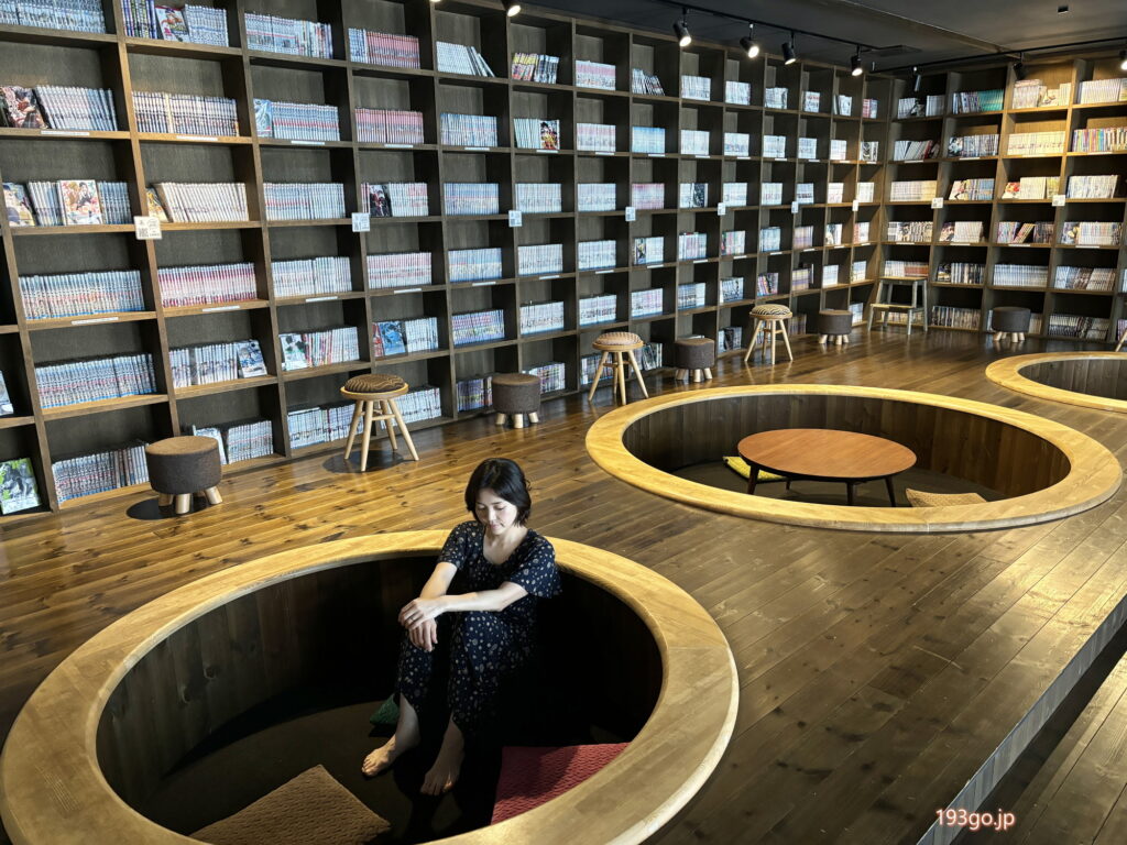 広々した休憩エリアには、多数のコミックが置かれた本棚の壁!オセロや将棋などのゲームに、無料のコーヒーサービス、マッサージチェアも。