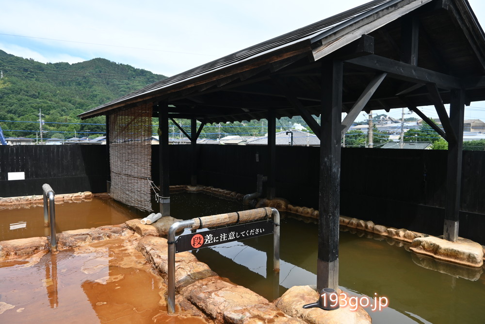 ツルツルした岩肌の露天風呂は、38℃前後のぬるめの湯で、赤褐色の柔らかい湯ざわりが気持ちい~。場所を移動すると深さが少しずつ変わるのも面白い。お隣の湯舟は寝湯用、かな。