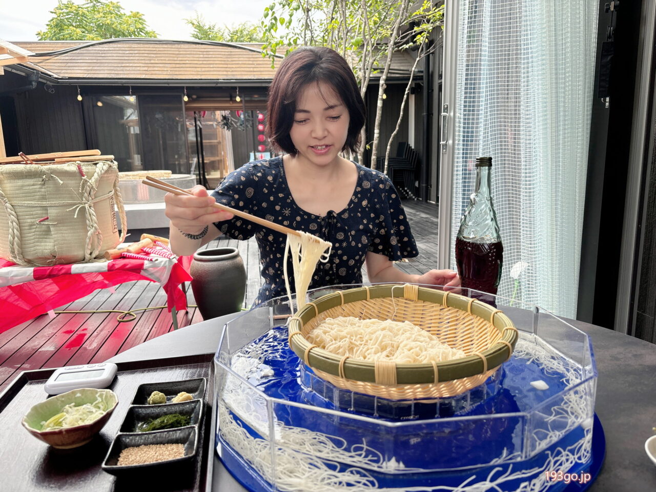 広々したテラスの席に着くと、回転式流しそうめん機がセットされ、中央のざるにそうめんが盛られてる。そうめんと麺つゆはおかわり自由の食べ放題~。