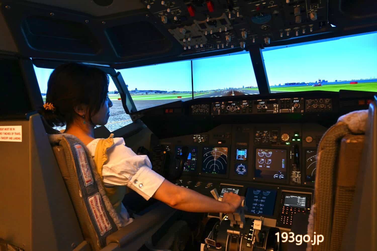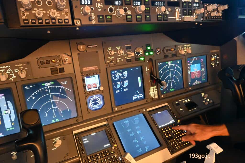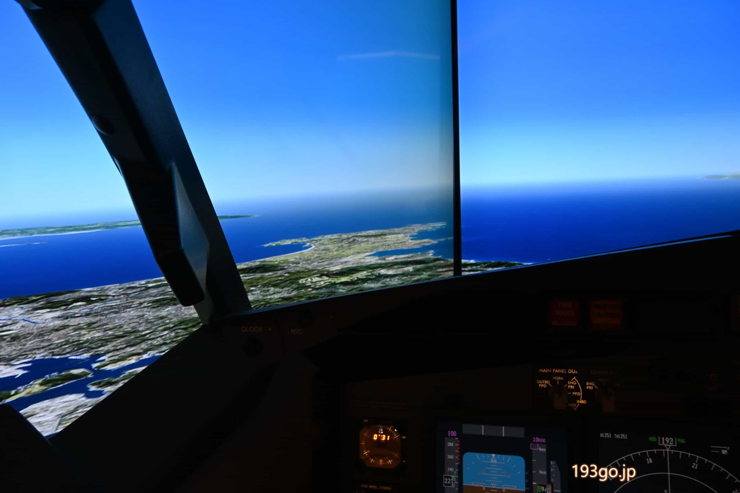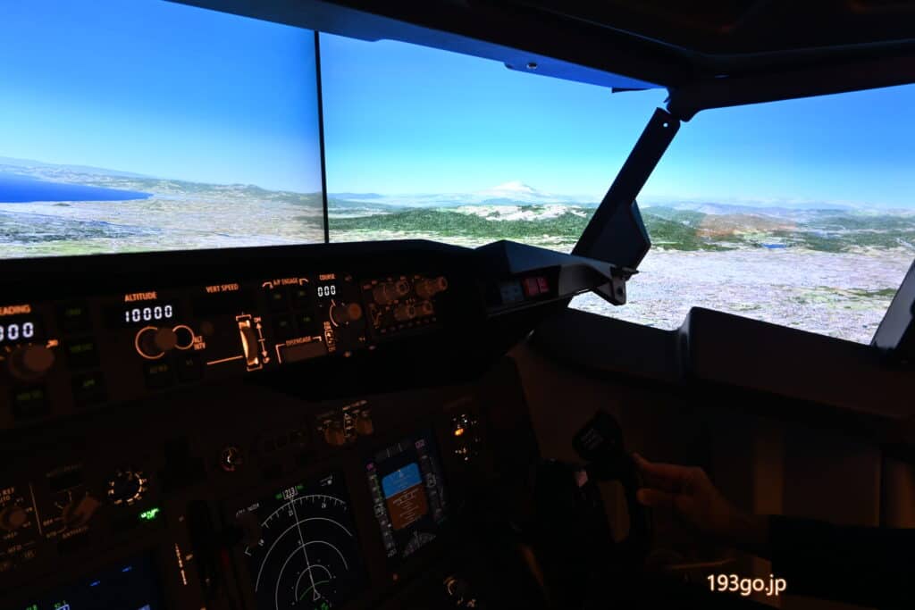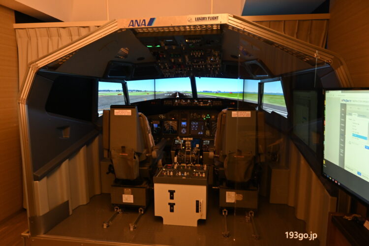 シミュレーター内のシートに座ったり、計器類に触れることはできないが、操縦席の後ろから透明のアクリル板越しに、飛行中の流れる景色とコックピット全体を見ることができる。