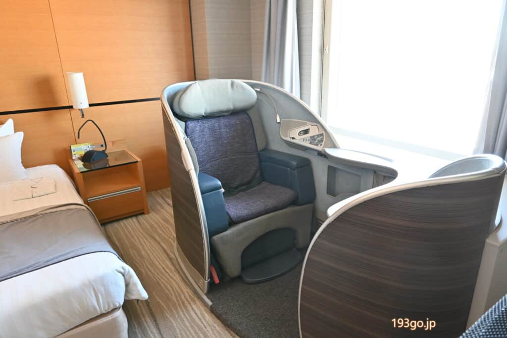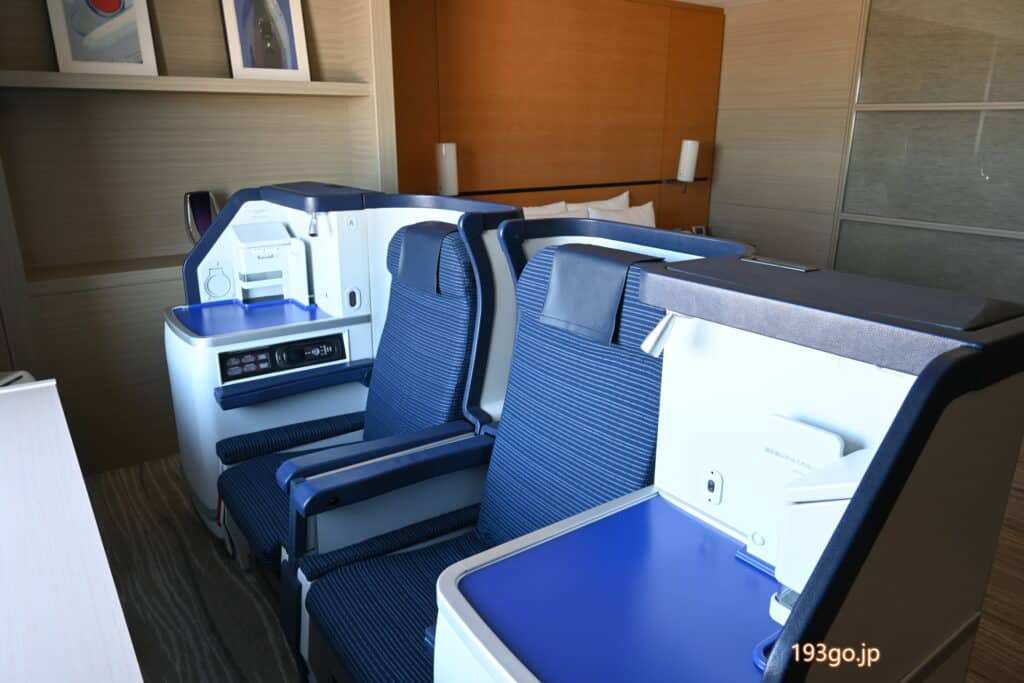国際線の飛行機で使用されていたファーストクラスのシート(座席)を設置した部屋。