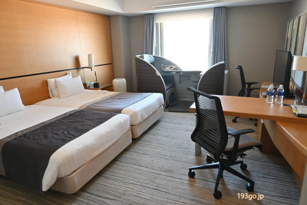 滑走路を正面に国際線ビジネスクラスのモックアップシートを2台並べて設置したビューバス付きダブルルーム。