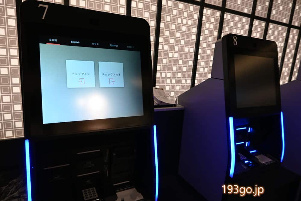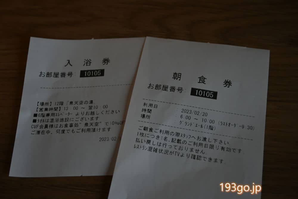 セルフチェックイン。予約名などを打ち込むと、ルームキーが出て来る。朝食券と入浴券も。