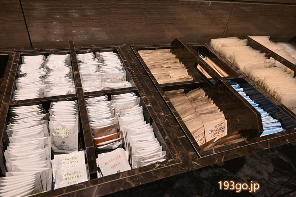 お茶&コーヒー、ボディタオル、ヘアブラシなどのアメニティもロビーでピックアップ。