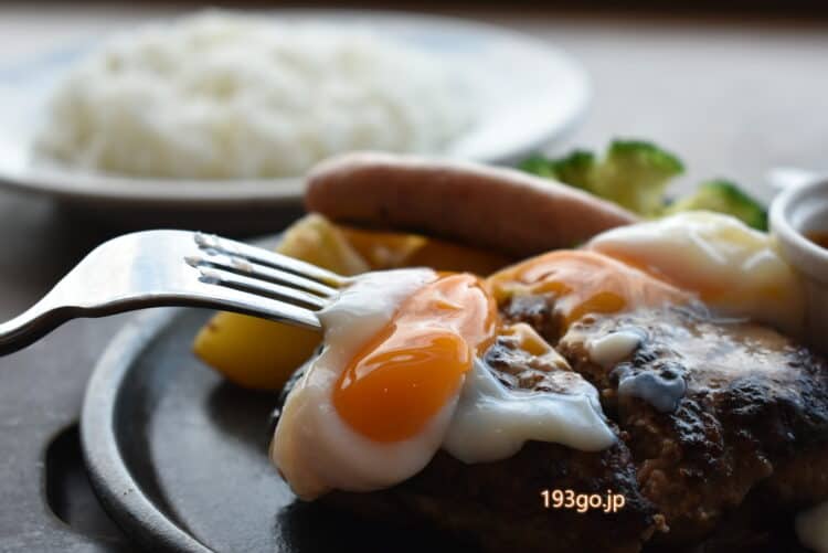 温玉をハンバーグに乗せて、デミグラスソースをかけて頂きまぁす。