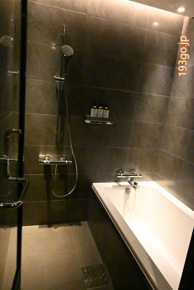 洗い場と分かれ、ハンドシャワーは水圧を3段階に切り替えが可能だ。