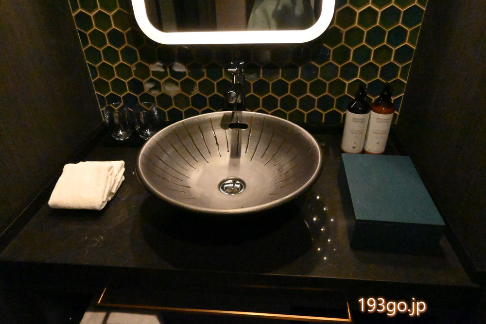 グレー基調に紫やブルーが差し色に。設備や造りに高級感を感じる。