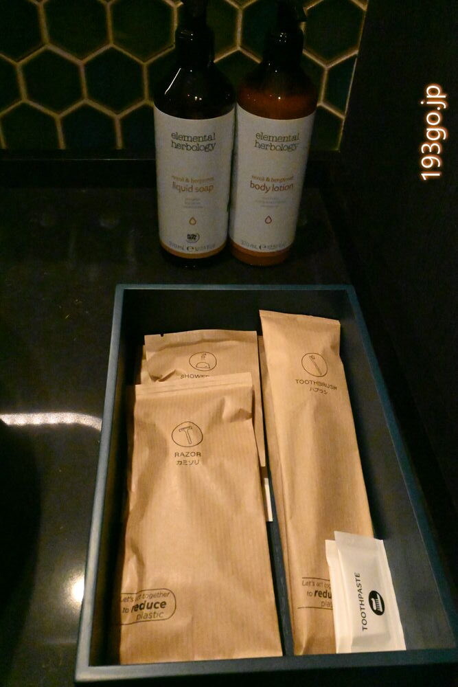 アメニティボックスには竹製の歯ブラシ、ヘアブラシ、綿棒&コットン、カミソリ。環境に配慮した紙製のパッケージだ。