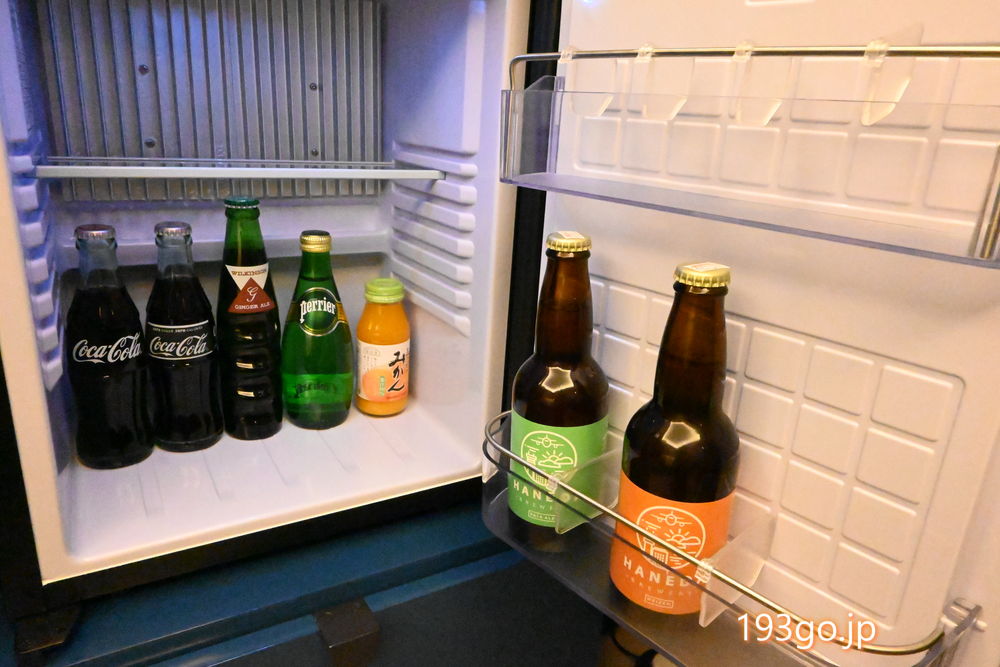 更に、10階と11階のハイフロアには冷蔵庫内にドリンクが用意され、ソフトドリンクは無料で楽しめる。みかんジュースやウィルキンソンが嬉しい! 羽田ビールは有料。