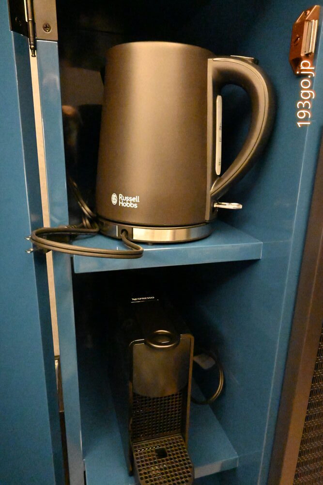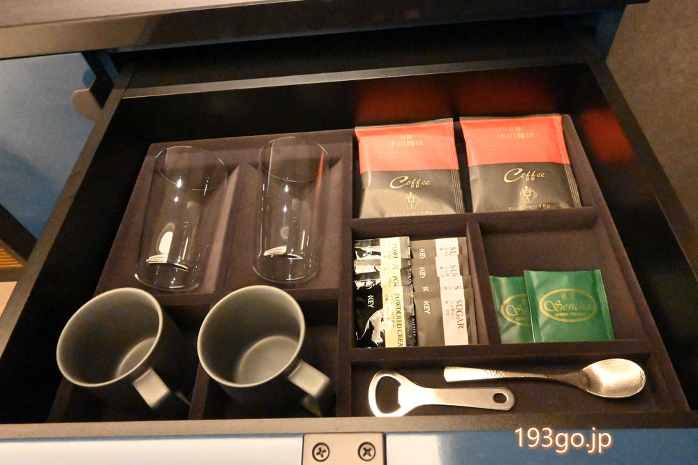 室内アメニティは、ティー&コーヒー、フリーウォーター、コーヒーマシン、電子ケトル、ティーカップ、グラス類が揃う。