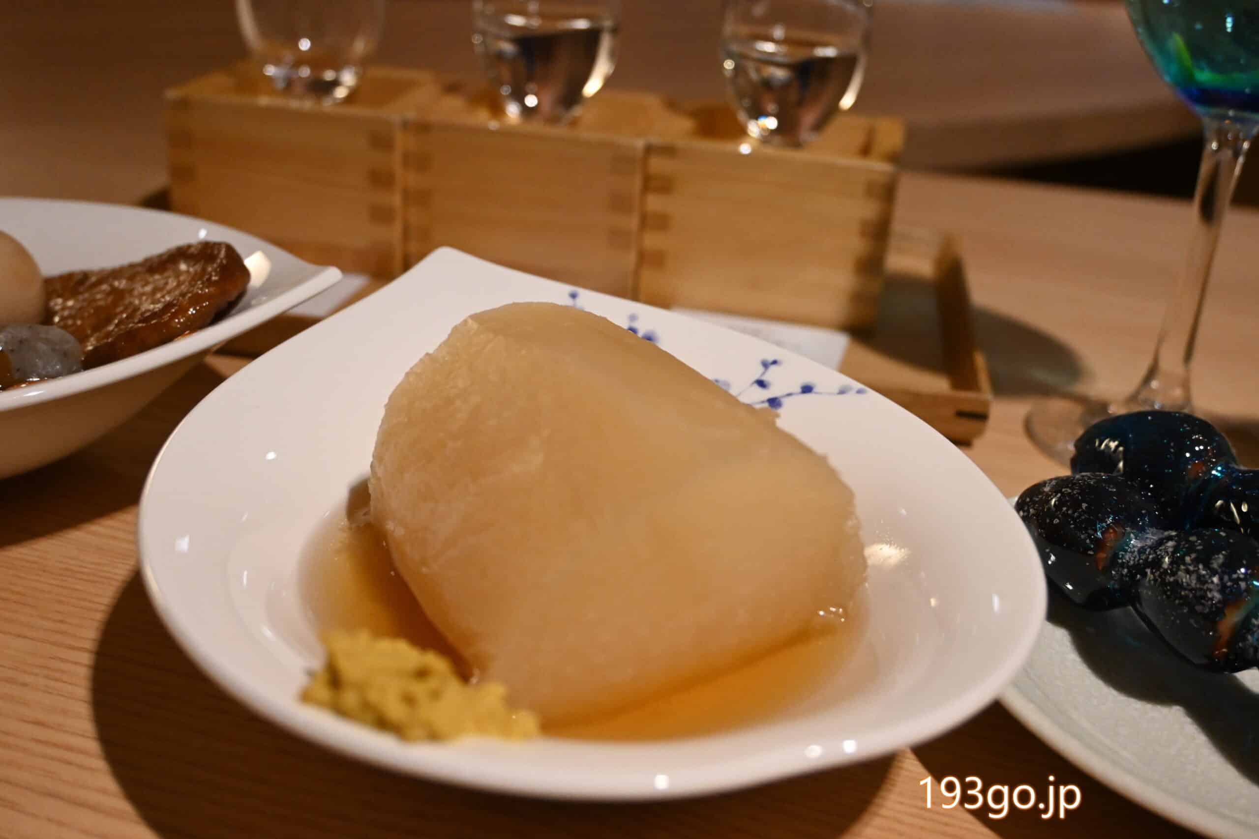 1本丸々煮込んだ⼤根は好きな大きさにカットしてもらえる。