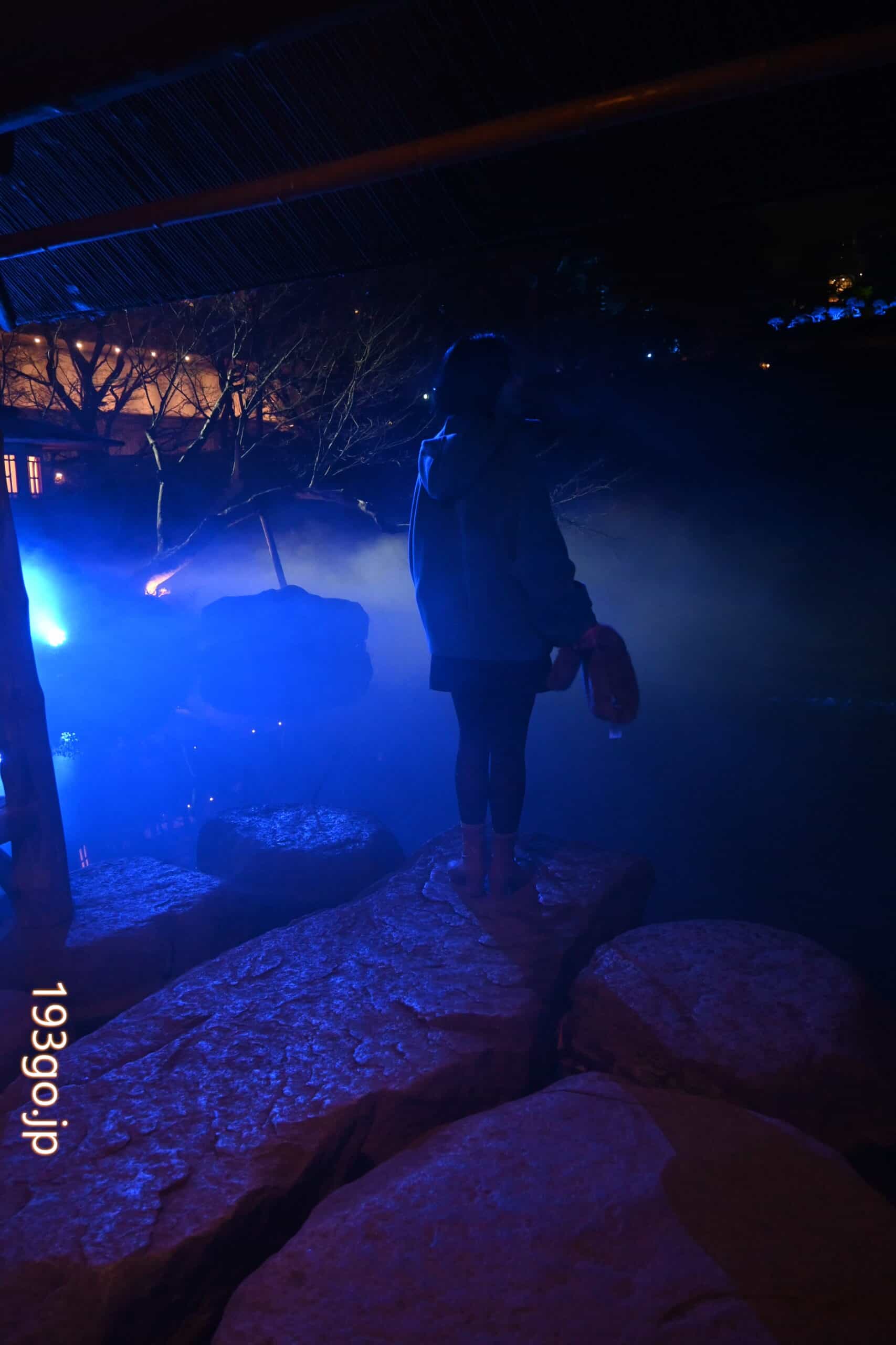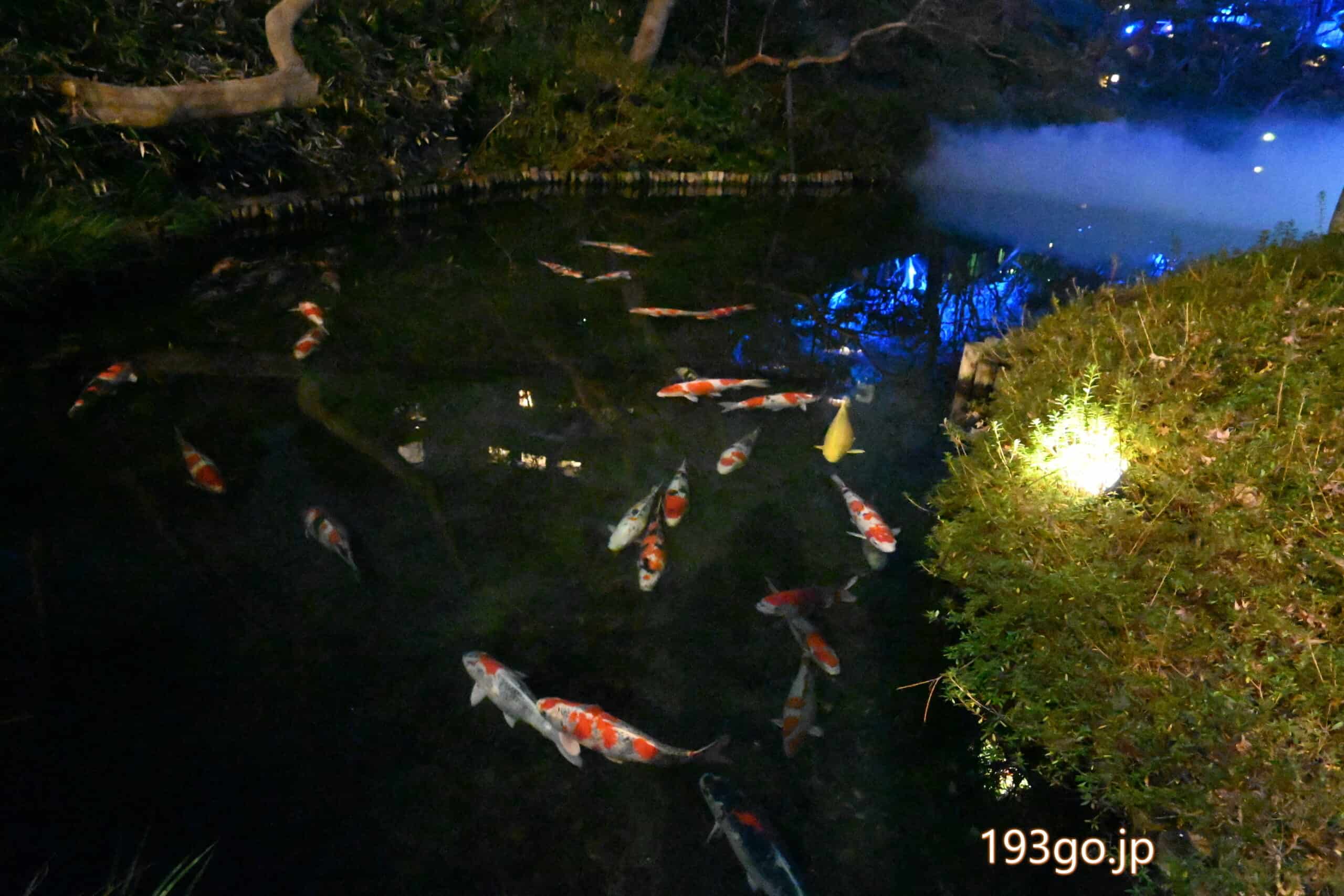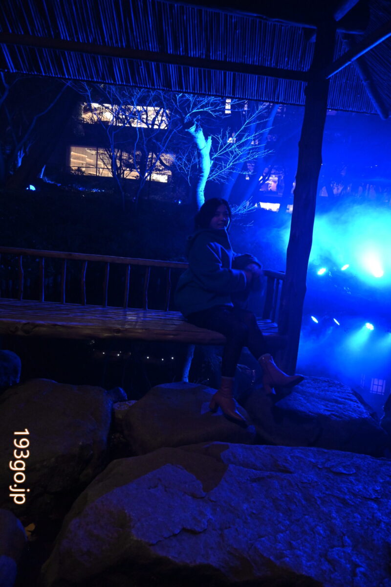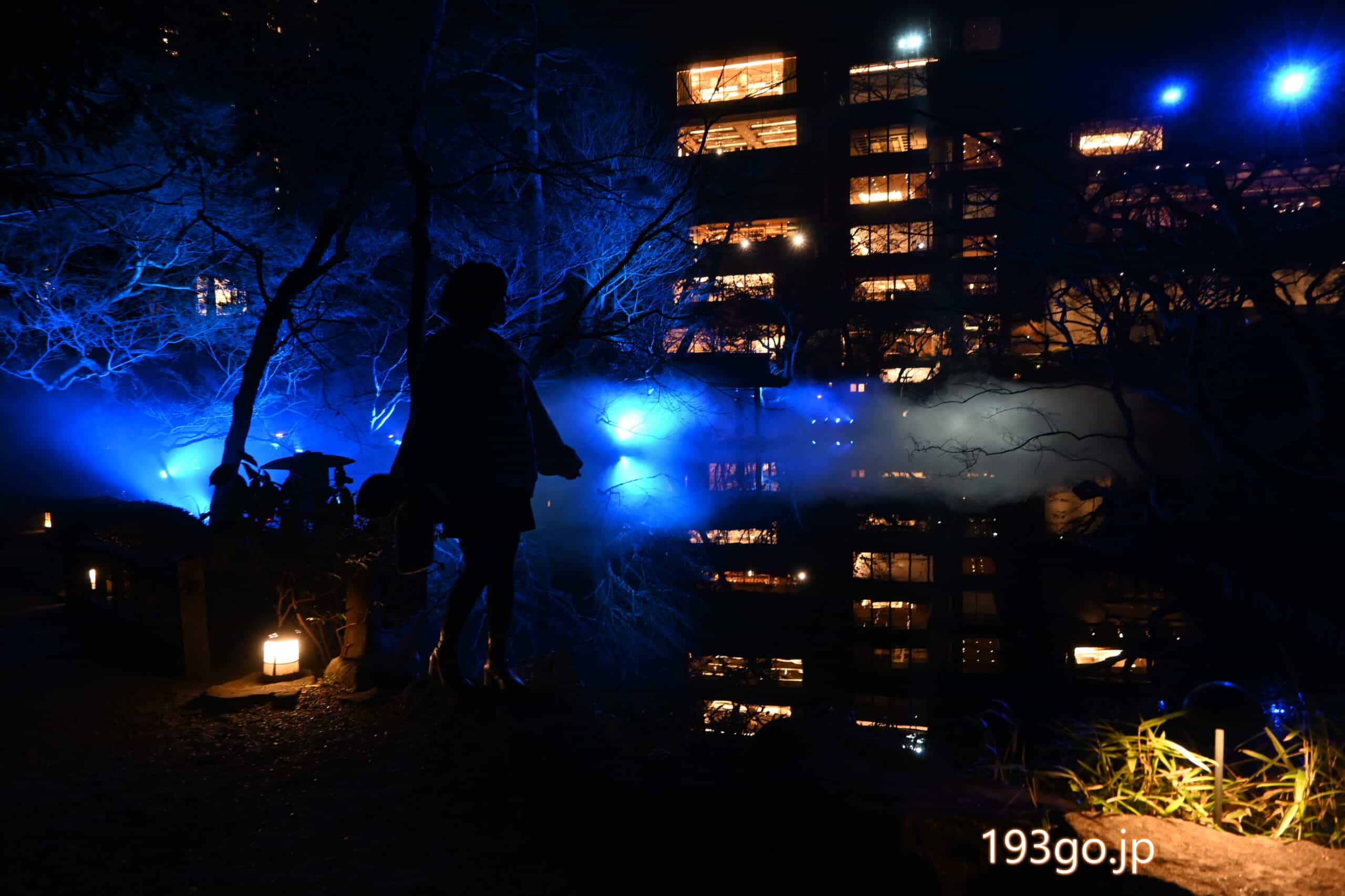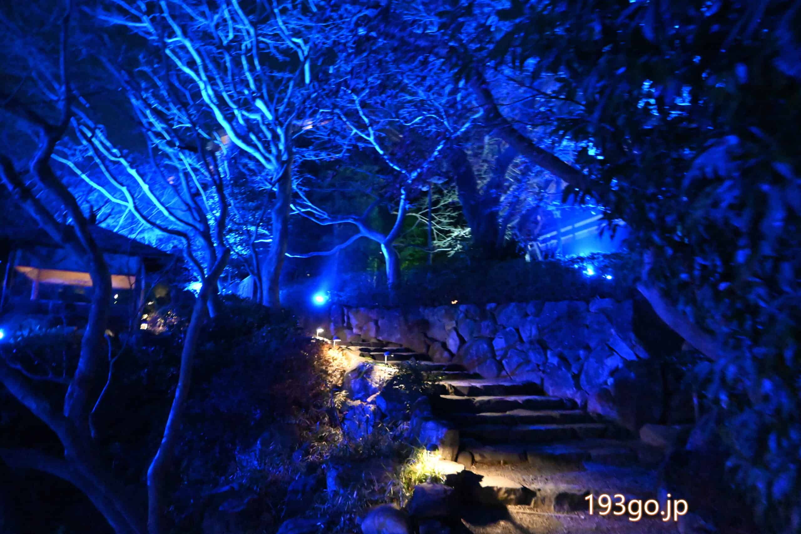 庭園に入ると、石畳の散策路や木々が青色に照らされ、水面に建物や自然が反射し幻想的。