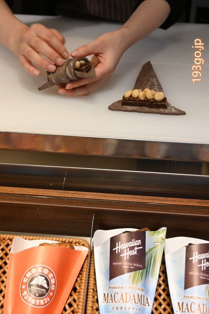 実際にチョコクロを作る工程を見学させてもらうと、マカダミアナッツを何粒も巻き込みオーブンで焼かれる。生地にもチョコレートがたっぷりと練り込まれてるので表面はサクッ、しっとりもちっとした食感だ。