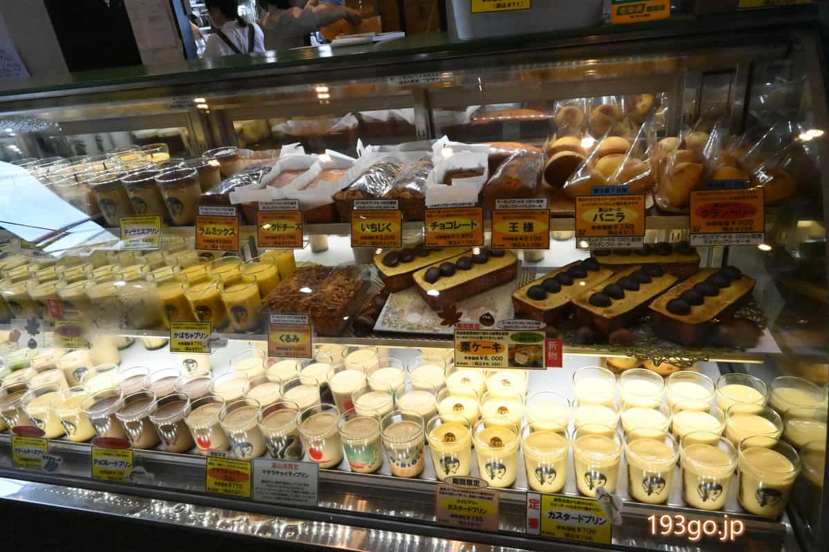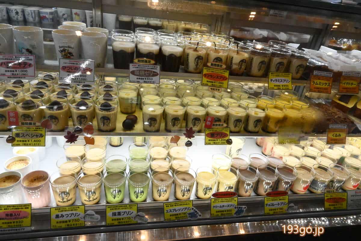 店頭のショーケースにプリンがズラリ。