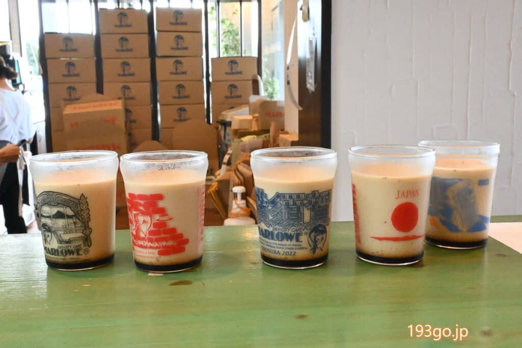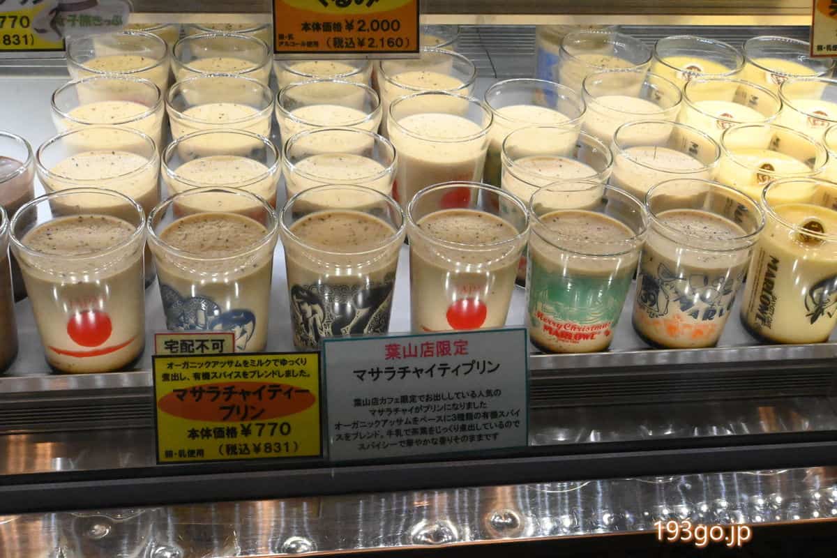 同じデザインのビーカーが並ぶが、葉山店限定のマサラチャイティプリンのみ、歴代のデザインのビーカーに入った特別仕様。