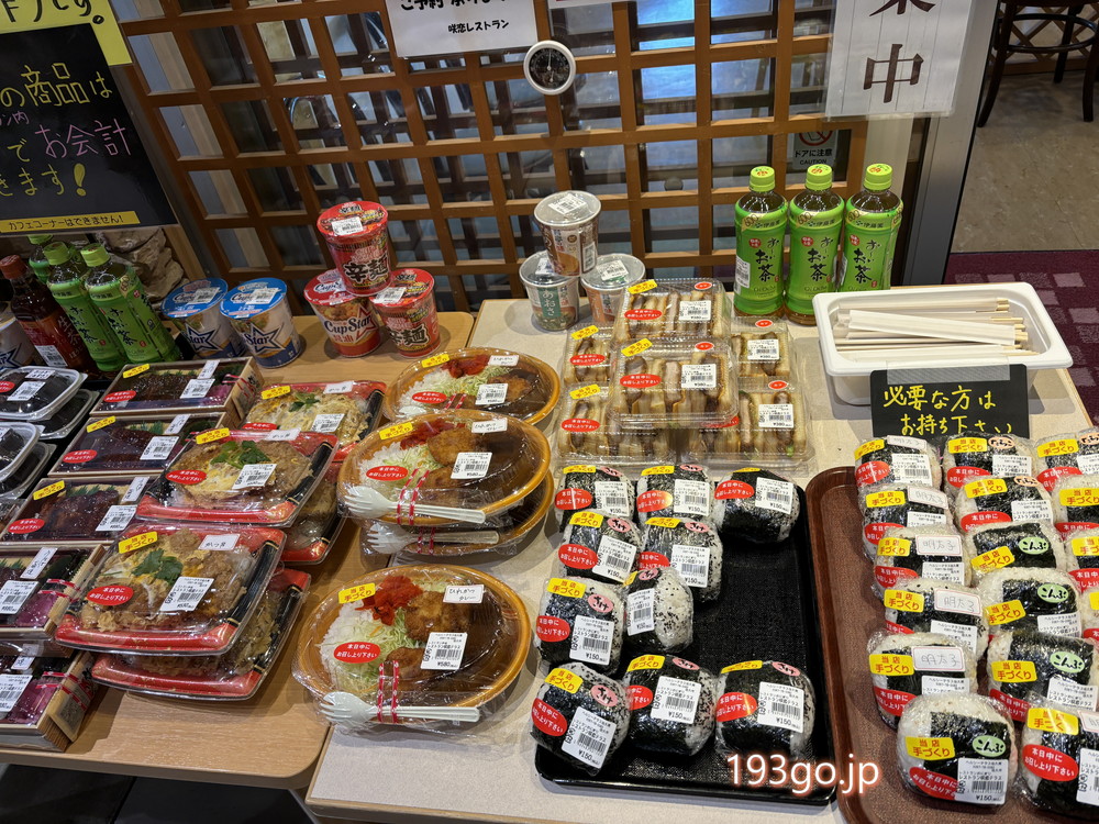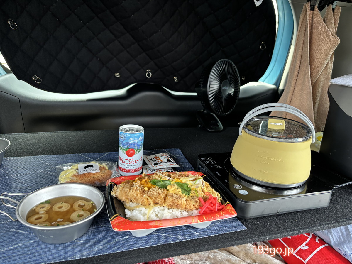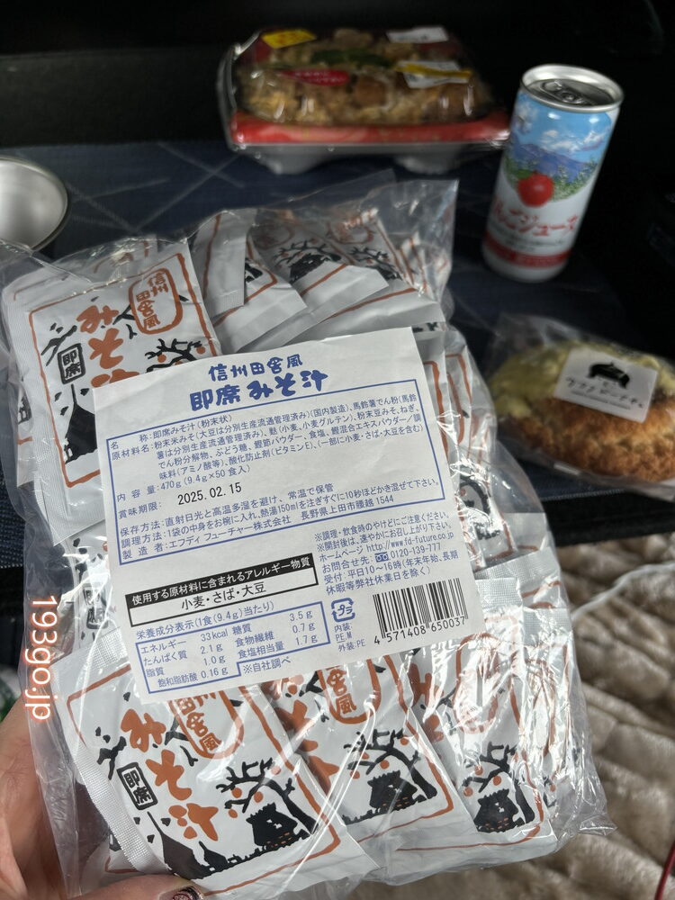 レストラン店頭にはお弁当やおにぎりなどのお惣菜がたくさん並べられ、かつ丼をゲット。まだ温かい!早速、車の中で朝ご飯。お湯で溶くだけの信州みそ汁と。大袋で1300円!