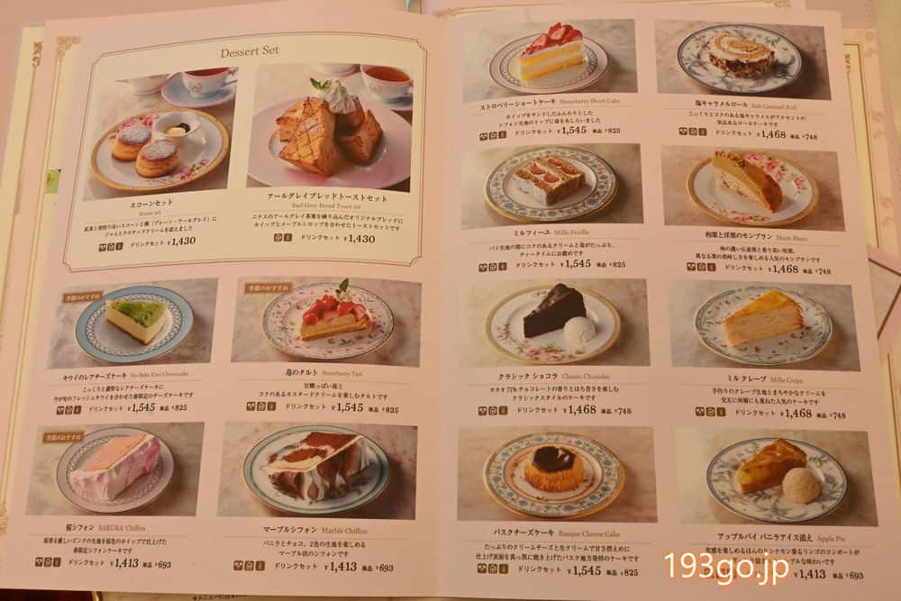スイーツは、スコーンや苺タルト、桜シフォン、キウイのレアチーズケーキ、ミルフィーユ、バスクチーズケーキなど種類豊富で、ケーキセットは1,500円前後で楽しめる。