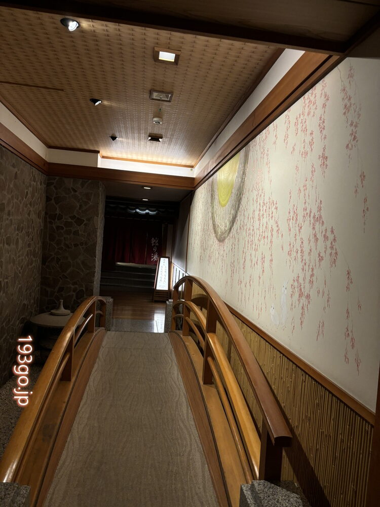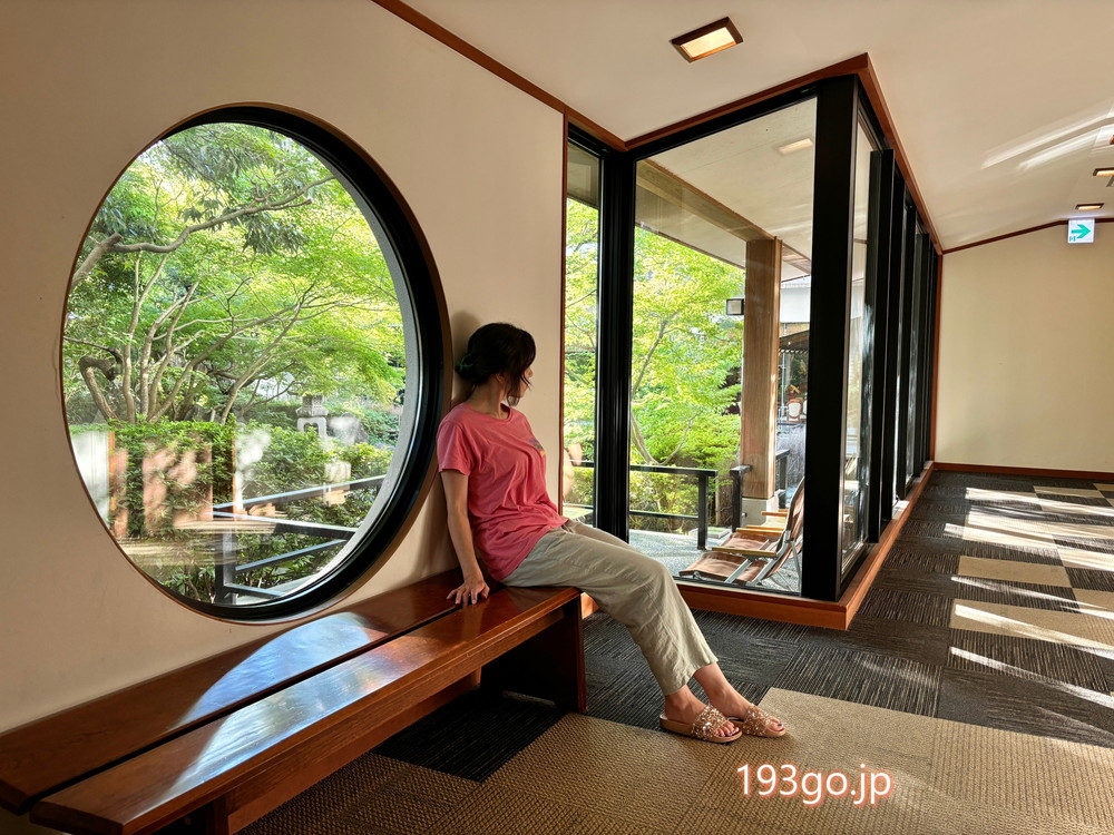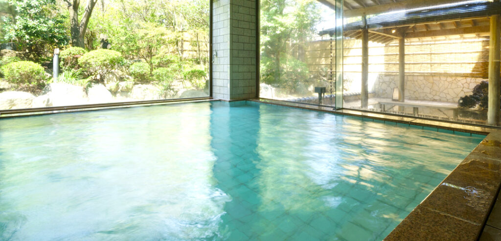 フロントでチェックイン(お会計)をしたら、庭園を眺めながら館内奥の大浴場へ。