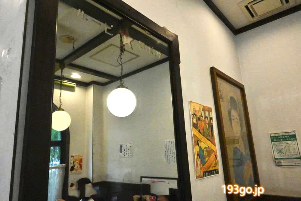 黒電話やかけ時計、ライトなど時代を感じるレトロな雰囲気。創業当初と思われる古い写真も貼られてる。