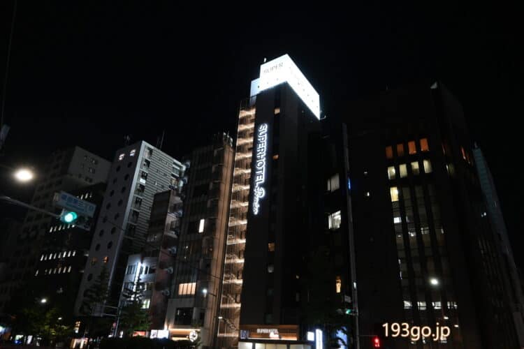 三原橋交差点近くの昭和通り沿いにある天然温泉の大浴場付きホテル。