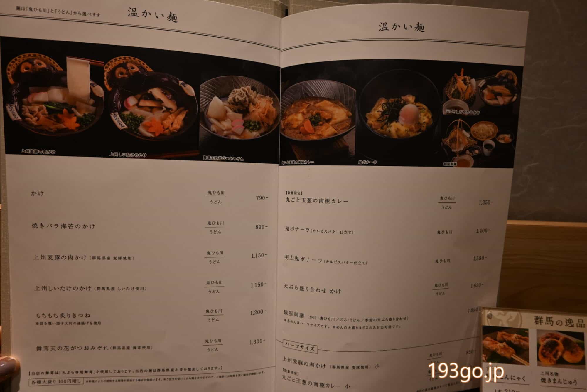 メニュー 温かいうどん、冷やしうどん名物・鬼ひも川か群馬小麦の伝統麺