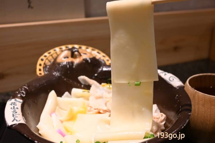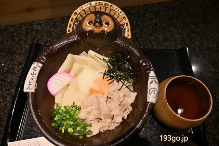 日本一のうどん・鬼釜!たぬきの器の極太ツルモチ麺 ぷるぷる麦豚も